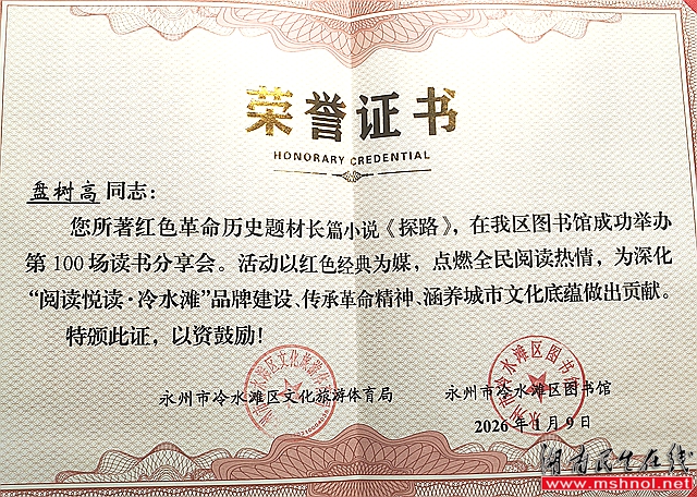 活动还举行了简朴而庄重的颁证与赠书仪式。冷水滩区文化旅游体育局党组书记、局长袁瑞明向盘树高颁发《探路》100场读书分享会纪念证书,见证这一文化盛事的里程碑时刻。随后,盘树高与市文艺评论家协会主席、湖南科技学院副教授刘忠华共同向区图书馆捐赠《探路》《对一条河流的仰望》《阳明在上》等著作,进一步丰富了馆藏地方文献与红色资源。