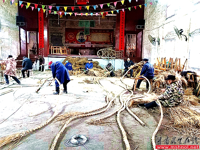 走进泉水镇南水村礼堂,一派忙碌的匠心场景映入眼帘——工匠们正全力赶制一条长达38.8米的香火龙。他们神情专注,以双手为器、稻草为料,有条不紊地编织龙身骨架。指尖翻飞间,一根根稻草、一支支龙香仿佛被赋予了鲜活生命力。现场的陈师傅介绍:“香火龙制作工艺复杂精细,得先把稻草扎制成数百米长、直径数厘米粗的‘赵公鞭’,再分节扎出龙头、龙颈、龙身、龙尾的造型,精准定位扎上龙足、龙爪和龙脊,最后用竹竿、绳索连接各节构件并装上抬杆,龙架才算成型。整条龙体插满龙香点燃后,火光闪耀、烟雾缭绕,舞动起来宛如腾云驾雾的真龙,活灵活现。” ![]()