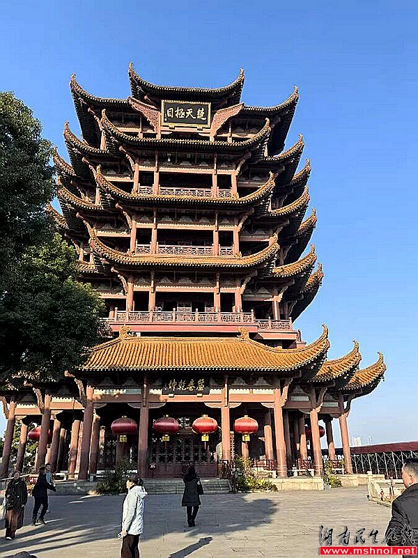 元月八日。天公作美,风和日丽,白云悠悠飘荡在澄澈的天际,全无冬日的萧瑟与寒凉。我们从西门(正门)步入景区,途经古朴庄重的圣像塔,沿着石阶缓缓上行,转过一道弯后,眼前豁然开朗——左右亭台错落对称,古色古香,正中的黄鹤楼巍然屹立,雄峙楚天,气势磅礴,令人心生敬畏。