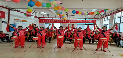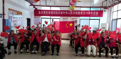 9月30日上午,永兴县社会福利院举行“庆国庆、迎中秋”联欢活动。身穿红马甲、手持小国旗的老人们和工作人员齐声合唱国歌,表达他们对祖国的深情厚意和美好祝福。