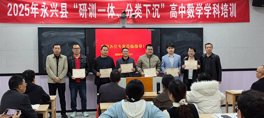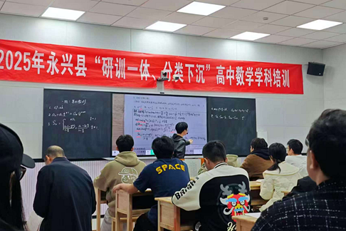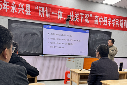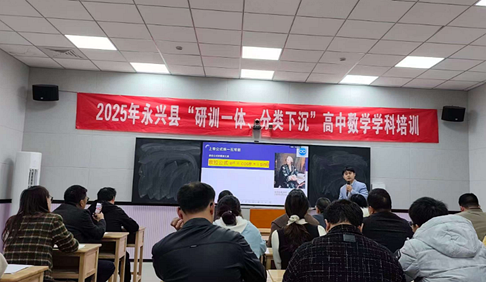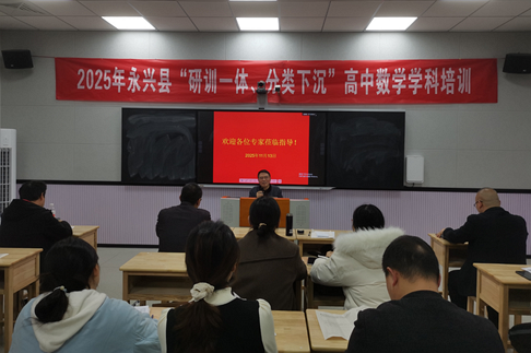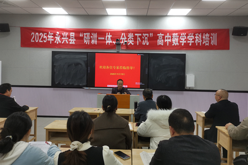 2025年11月13日,永兴县“研训一体,分类下沉”高中数学学科研训活动在永兴三中顺利开展。永兴县教师发展中心副主任赖海轼、教师李良文到场指导。永兴县高中数学学科工作室领衔人李华清及核心成员、多所学校高中数学教师代表与永兴三中全体数学教师齐聚一堂,共赴这场聚焦教学实践与专业成长的研训盛宴。永兴县高中数学学科工作室核心成员,永兴三中党总支副书记、校长黄斌主持活动并在开班仪式上致辞。