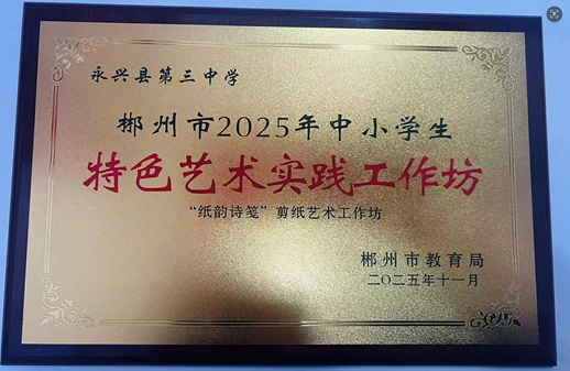 2025年11月28日,永兴县第三中学“纸韵诗笺”剪纸艺术工作坊参加郴州市艺术工作坊展示交流活动,被郴州市教育局授予“特色艺术实践工作坊”称号。