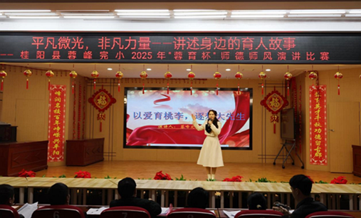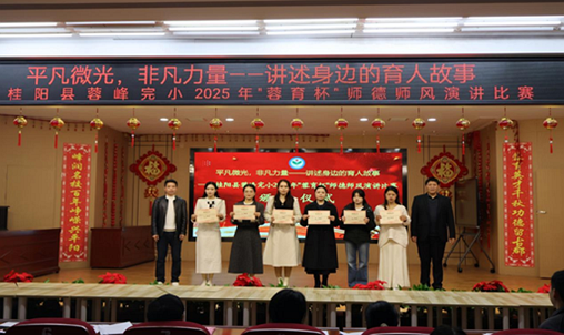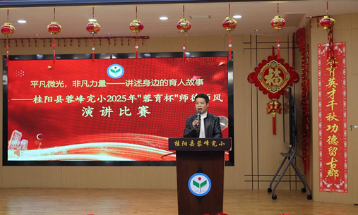 12月18日下午,桂阳县蓉峰完小多功能报告厅内,一场以“平凡微光,非凡力量——讲述身边的育人故事”为主题的2025年“蓉育杯”师德师风演讲比赛正在火热进行。该校各年级组的6位教师依次登台,以亲身经历为墨、以育人初心为笔,用一个个真挚动人的故事诠释师者担当。