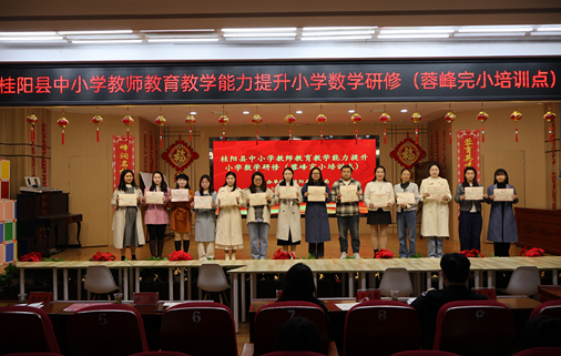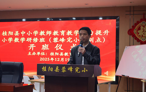 2025年12月19日,桂阳县中小学教师教育教学能力提升小学数学研修活动在蓉峰完小培训点正式开班。此次活动由桂阳县教育局主办。开班仪式由桂阳县教师发展中心主任李智勇主持。蓉峰完小校长唐湘斌、副校长龙海星,北关完小副校长周牡丹以及片区各校数学教学骨干参加了开班仪式。