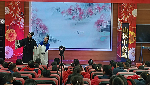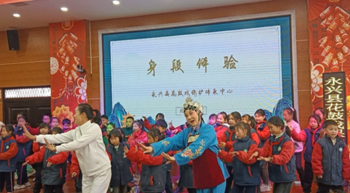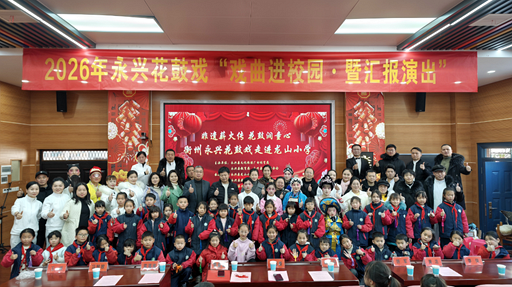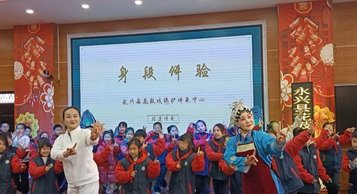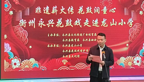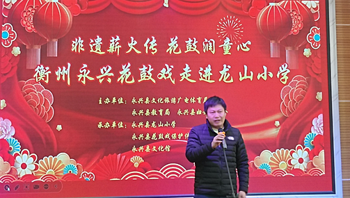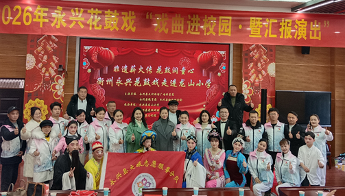 1月9日上午,永兴县龙山小学多媒体教室锣鼓声声、唱腔悠扬,“非遗薪火传·花鼓润童心”——2026年永兴花鼓戏“戏曲进校园·暨汇报演出”活动在此举行。