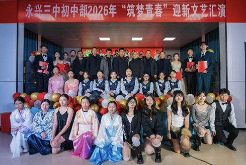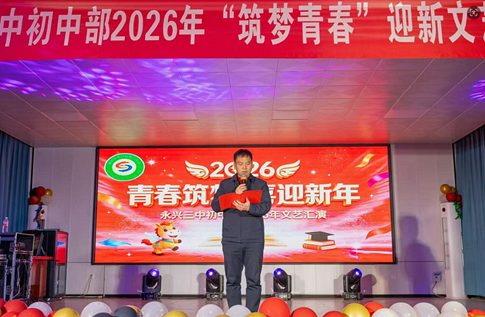 2026年1月8日晚,永兴三中初中部大礼堂内灯光璀璨、掌声雷动,一场以“青春筑梦”为主题的2026年迎新文艺汇演在此倾情上演。学校党总支书记李久仁、校长黄斌及校领导班子其他成员与全体师生齐聚一堂,共同欣赏这场洋溢着青春活力与艺术魅力的文艺盛会。