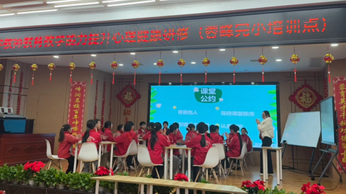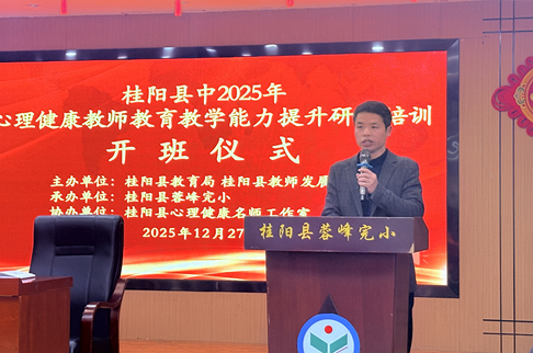 2025年12月27日,由桂阳县教育局、县教师发展中心主办的“中小学心理健康教师教育教学能力提升研修培训活动”在蓉峰完小温暖开启。开班仪式由桂阳县教师发展中心李智勇同志主持,蓉峰完小校长唐湘斌为本次活动致辞。全县各中小学心理健康教育骨干参加了培训。