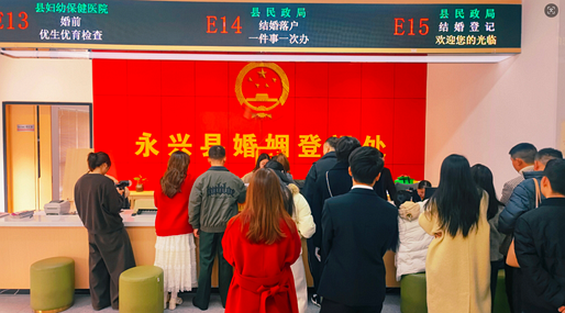 新春佳节临近,浪漫氛围愈发浓厚,永兴县婚姻登记处迎来节前婚姻登记业务办理高峰。为切实提升服务效率,减少新人等候时间,永兴县民政局提前谋划、周密部署,于2月14日抽调五名业务骨干前往县政务服务中心婚姻登记处增援。通过增设办理窗口、安排专人引导分流等贴心周到举措,全力保障婚姻登记工作高效、有序开展。