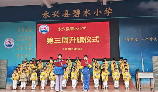 3月16日,永兴县碧水小学在校园操场举行第三周升旗仪式。该校全体师生在庄严的仪式中厚植爱国情怀、找到学习榜样,进一步筑牢理想信念。