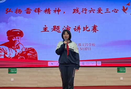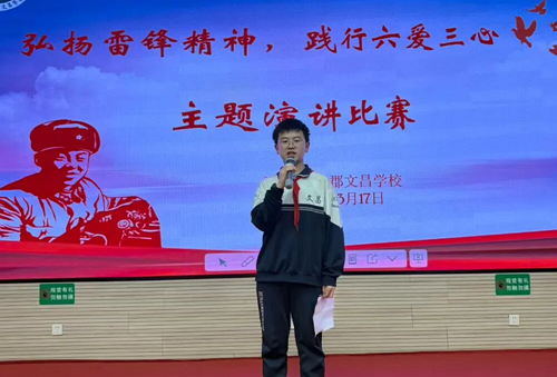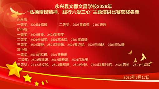 为深入学习和弘扬雷锋精神,引导全校学生践行“六爱三心”德育理念,2026年3月17日晚,永兴县文郡文昌学校在高中部报告厅举行了一场以“弘扬雷锋精神,践行六爱三心”为主题的演讲比赛。来自该校小学部、初中部、高中部的参赛学生齐聚一堂,用真挚的语言、鲜活的事例,诠释新时代雷锋精神的青春注脚。