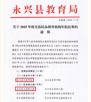 2025年12月,永兴县教育局对全县95所民办学校的办学情况进行了年度检查评估,评选出11个“优秀办学单位”。永兴县文昌学校、文昌幼儿园凭借规范的办学管理、过硬的教育教学质量与优质的保育服务,双双获此荣誉。