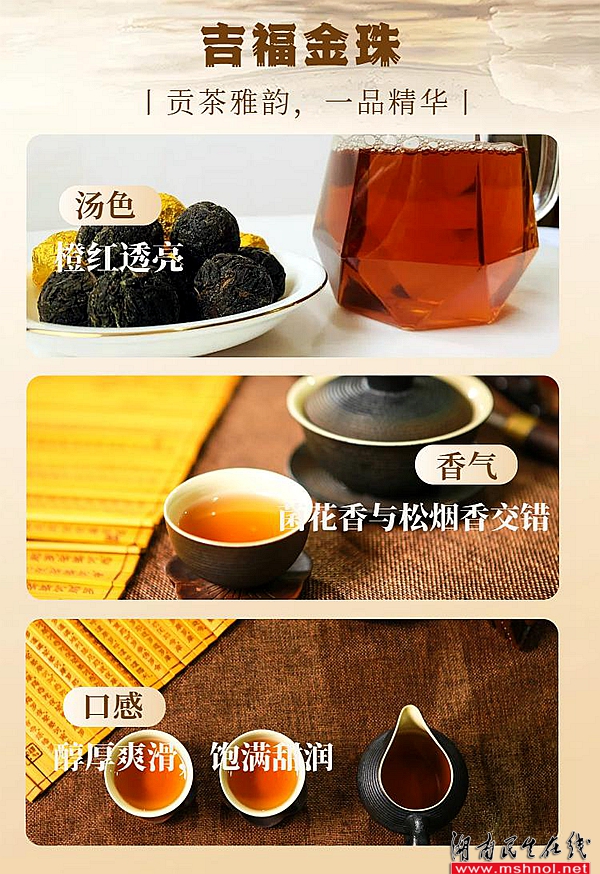 外观上,“吉福金珠”形似珍珠,每颗净重6.25克,金铂纸独立包装,精致便携;茶体金花密布、灿烂夺目,冲泡后汤色橙红透亮,茶香与菌香交织,滋味醇厚绵长、回甘爽滑,叶底黑褐油润。