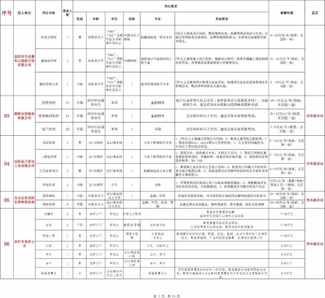 江湖那些事获悉,岳阳再发布人才招募令。为推进巴陵人才工程,助力“四大会战”,打造湖南通江达海的新增长极, 11月19日,我市将组织部分企事业单位赴武汉开展2017年“四海揽才”武汉冬季人才招聘活动。 此次四海揽才武汉冬季人才招聘活动共组织182家企事业单位参会,提供1692个工作岗位。其中,事业单位有94家,占参会单位数量的51.6 %,共提供224个岗位;企业单位88家,占参会单位数量的48.4 %,提供就业岗位1468个。 从行业类别来看,参会单位中事业单位主要集中在教育、医疗两大行业,其数量占事业单位总数的66.9%;参会企业主要来自于城陵矶新港区和岳阳经济技术开发区,合计占企业总数的81.8%,人才需求集中在装备制造、能源化工、生物医药、投融资等领域,这也是目前岳阳经济发展的几大支柱行业,充分体现了岳阳经济特色和实际人才需求。 此次招聘岗位最低学历要求为本科,且提供的年薪均在5万元以上,主要面向的是中高层次人才。其中学历要求为硕士及以上的岗位367个,占招聘岗位总数的21.7%,主要集中在能源化工、投融资、装备制造类企业和高职院校、医院等事业单位。岗位薪酬主要集中在8-12万元,在此薪酬区间内的岗位数量为1138个,占岗位总数的67.3%,年薪在5-8万元的岗位占比为20.4%,年薪在12万元以上的岗位占比为12.3%;其中方正证券以40万年薪招徕金融人才拔得此次四海揽才招聘活动的“头筹”。 时间地点:11月19日(周日)9:00-12:00 武汉大学工学部体育馆 具体职位:
