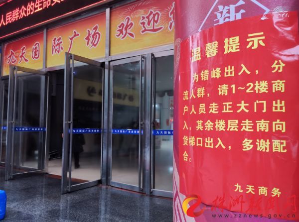 2月26日开市的九天国际广场正大门张贴着人群分流提示。记者 刘姝琪 摄 随着各专业市场相继复市,芦淞市场群正逐渐恢复往日人来人往的热闹场景。此前,受疫情影响,芦淞市场群经历了有史以来最长的一次休市。2月26日,九天国际广场、九天布辅市场开门营业,拉开了芦淞市场群复市的序幕。